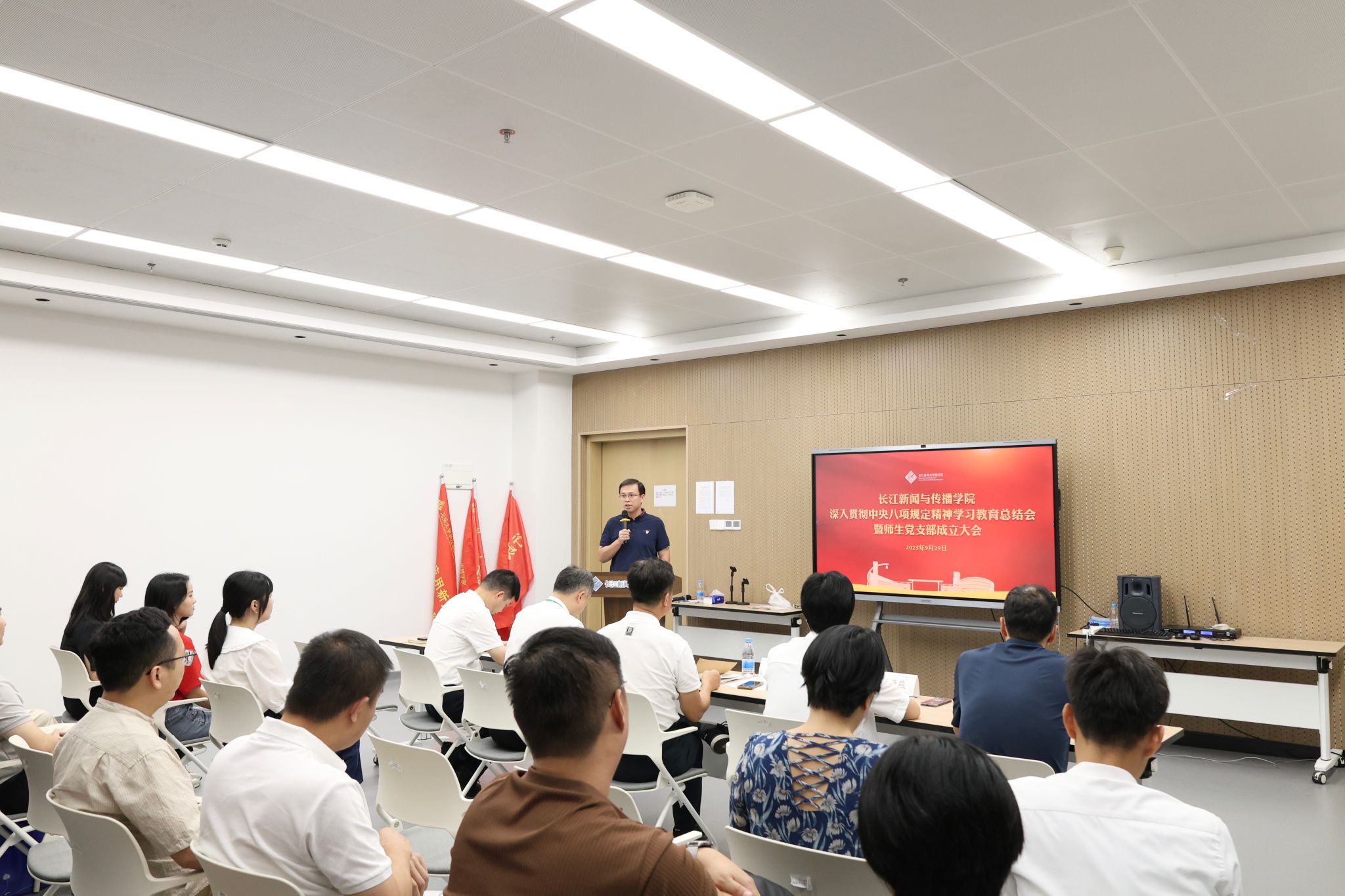 为落实第二十八次全国高校党的建设工作会议精神,推动党建和业务深度融合,9月29日下午,长江新闻与传播学院在东海岸校区914会议室召开深入贯彻中央八项规定精神学习教育总结会暨师生党支部成立大会。