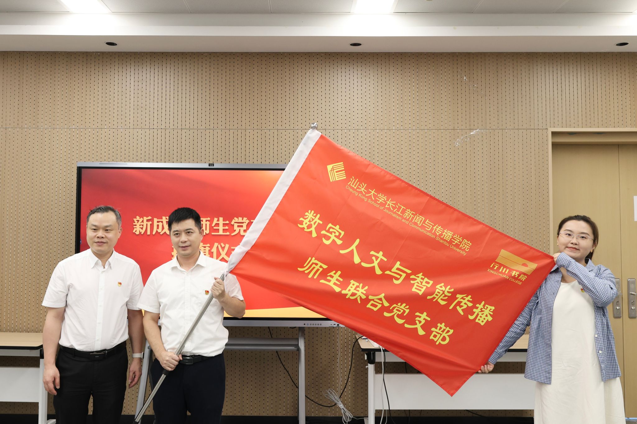 为切实推动党建与业务深度融合,落实立德树人根本任务,学院党委积极践行组织创新、品牌创新、思政创新,打破教师党支部与学生党支部、学院与书院的壁垒,将相同学科方向的师生党员组织在一起,对现有师生党支部进行优化重组:将原来的教职工第一党支部(即专任教师党支部)、本科生党支部和研究生党支部整合为两个党支部,命名为“长江新闻与传播学院·行川书院中国特色应用新闻学师生联合党支部”和“长江新闻与传播学院·行川书院数字人文与智能传播师生联合党支部”,原教职工第二党支部更名为行政教辅党支部。曾锐为三个新成立党支部授旗,现场掌声热烈。