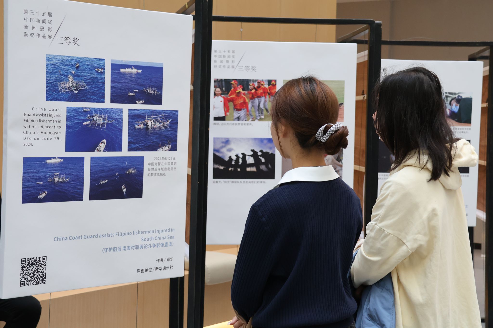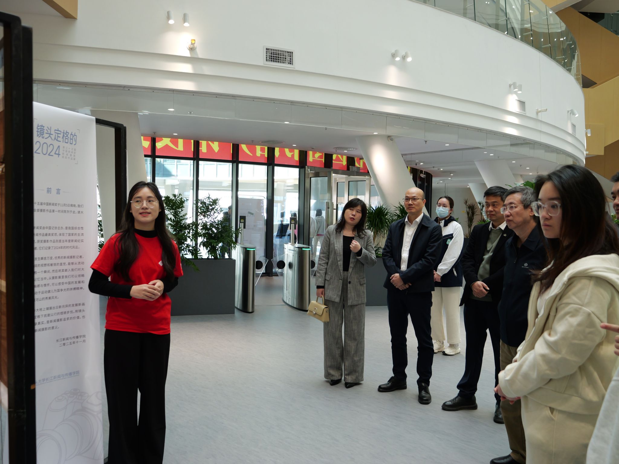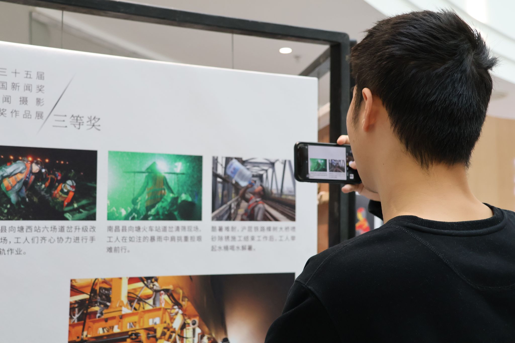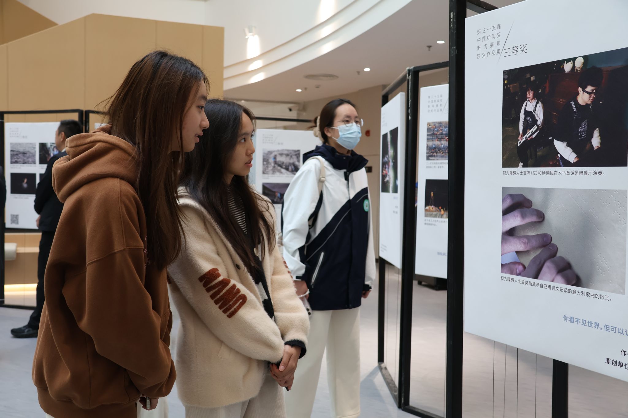 揭幕仪式落幕后,展览现场即刻成为师生交流学习的热门打卡地。大家纷纷驻足在佳作前,凝视影像、交流心得、分享感悟。“《你看不见世界,但可以让世界看见你》这组作品让我格外动容,视障群体在黑暗中追光的坚韧太有力量了。”2024级新闻学专业学生吴韵韵说。她谈到,作品中记者对特殊群体的人文关怀与细腻捕捉,让自己深刻领悟到“新闻不仅是客观记录,更是温暖传递”,也为未来的新闻实践埋下初心种子。