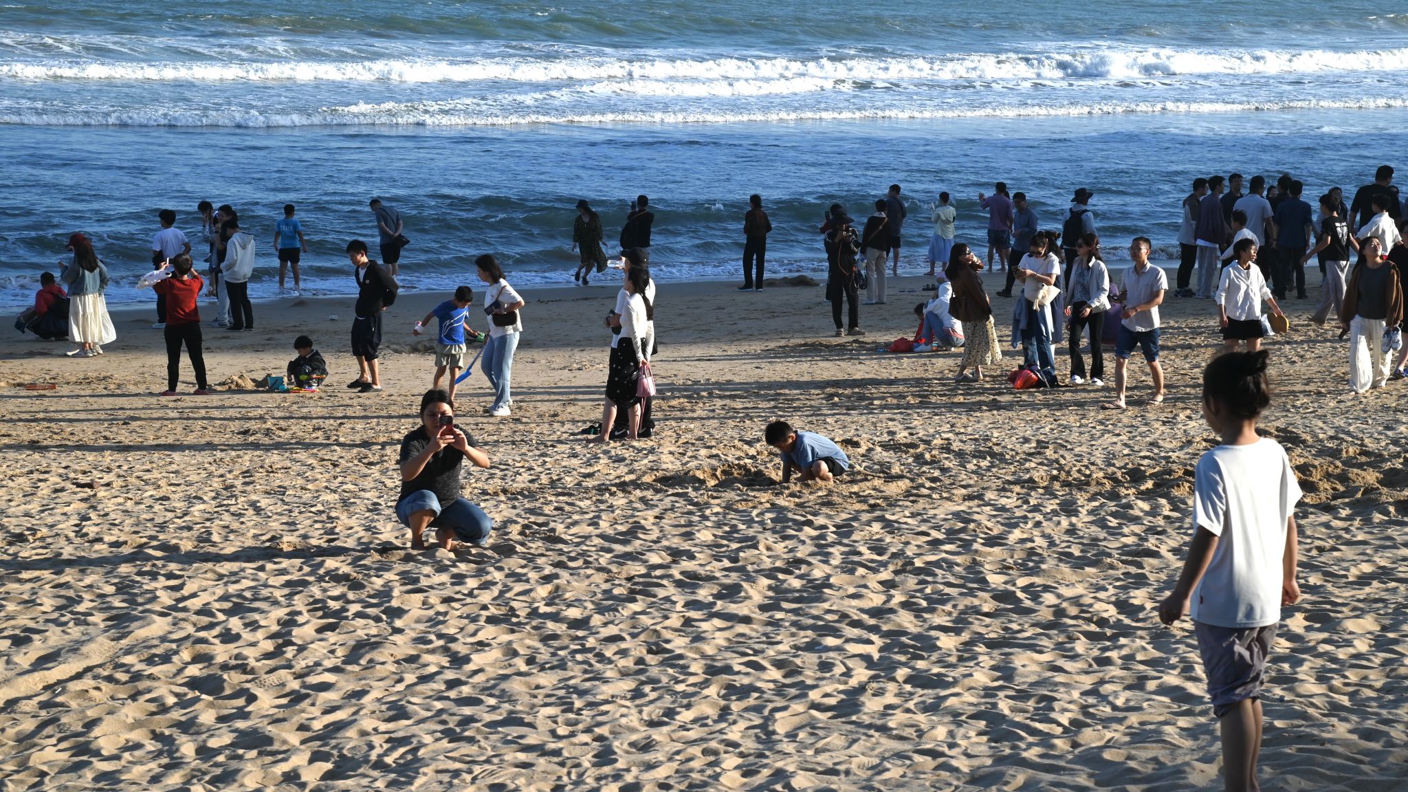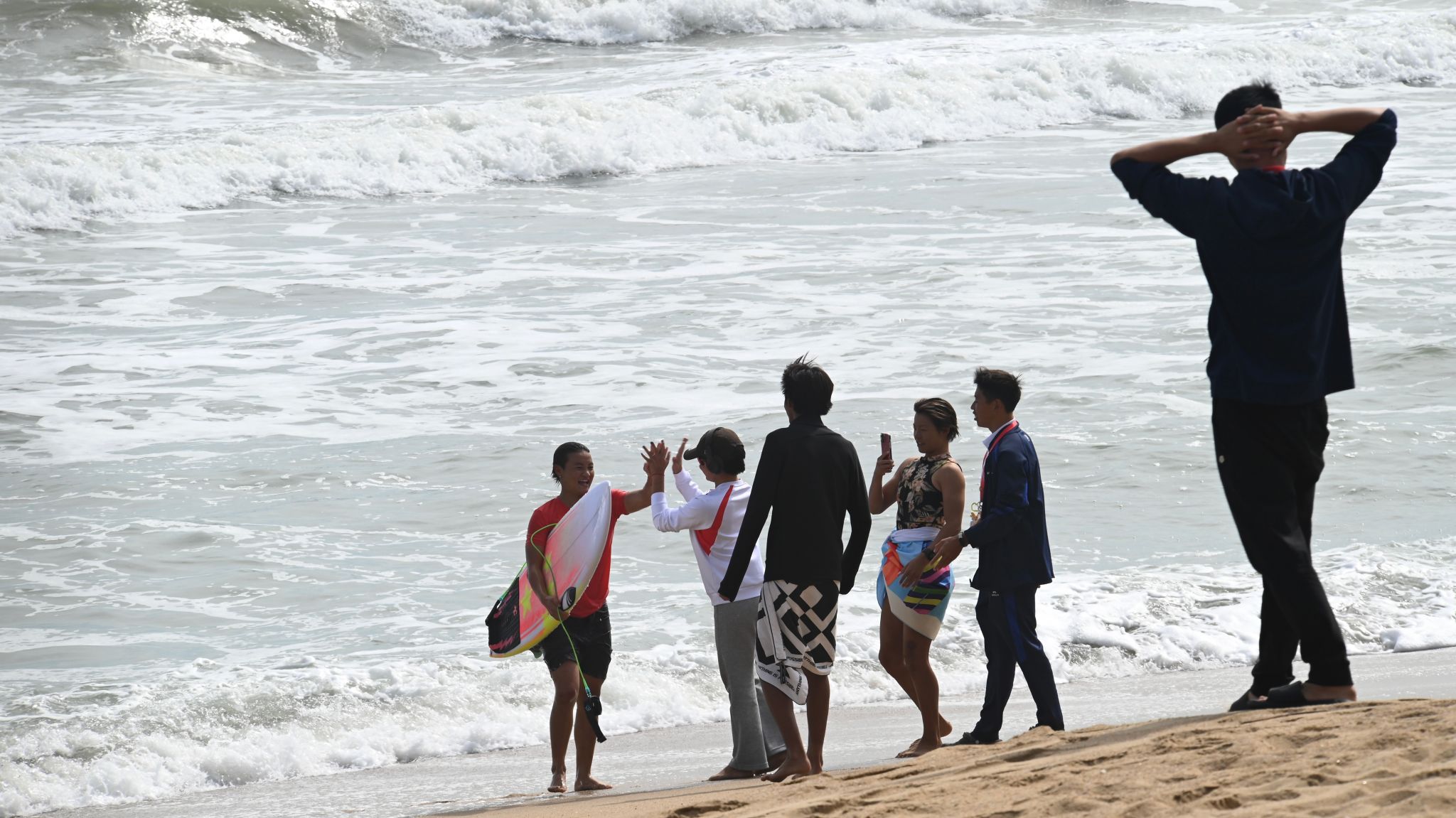 冲浪选手在离同学们不足百米的海面起身、转向、平衡,带队老师看着分散在沙滩各处的学生,语气里带着难掩的兴奋:“没有比这更生动的课堂了。同学们正在学习的,不只是构图曝光,更是如何在重大事件的现场找到自己的视角。”