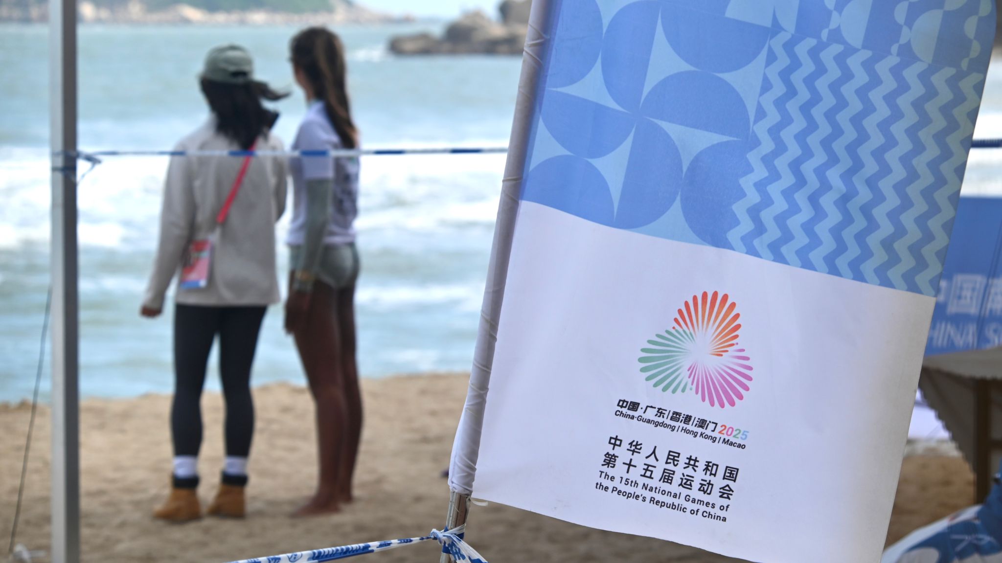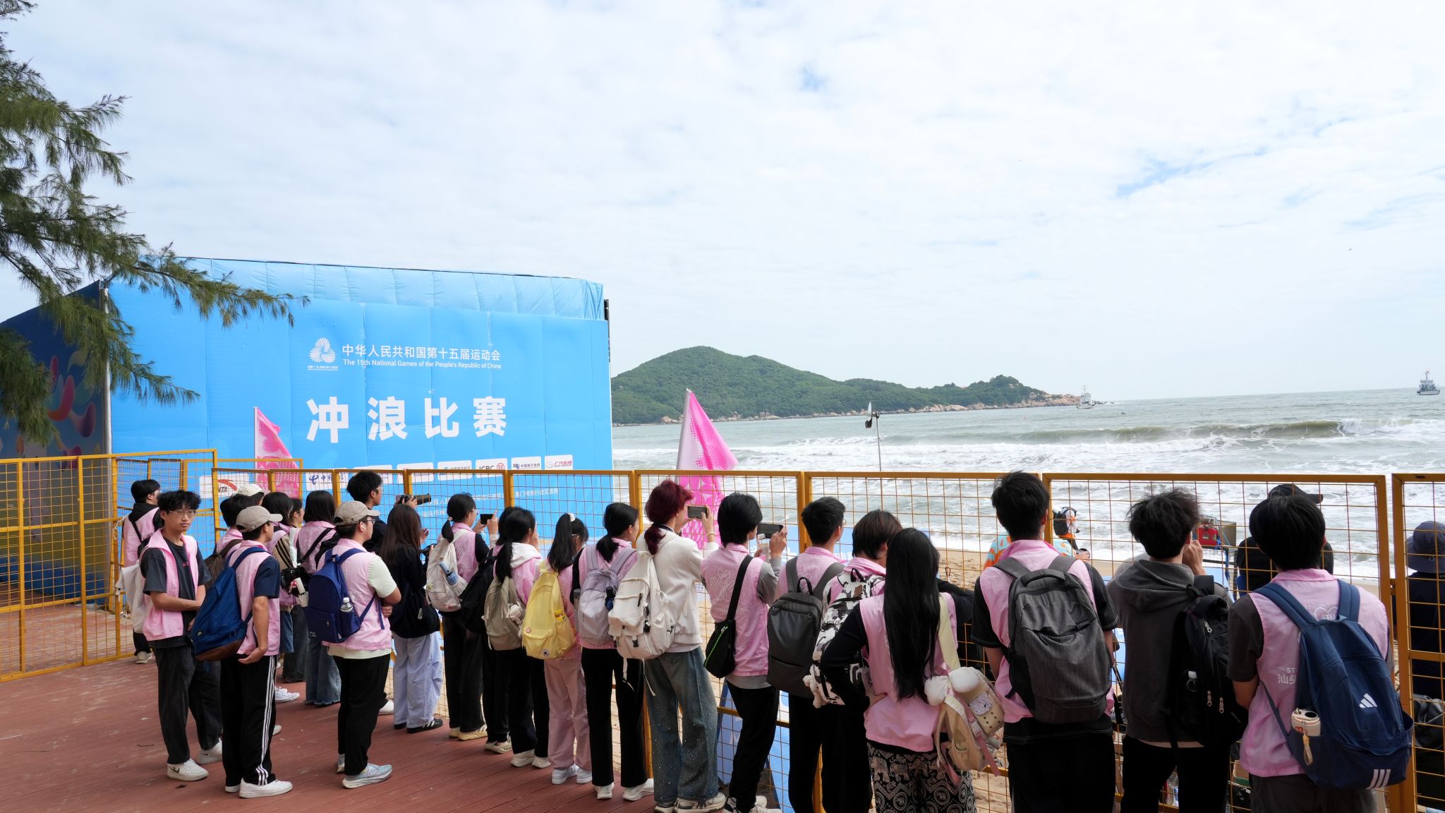 这是一个别样的课堂。海浪声取代了上课铃声,教室是整片海湾,课桌是绵延的沙滩,教具是手中的相机,教材则是全运会冲浪比赛现场。