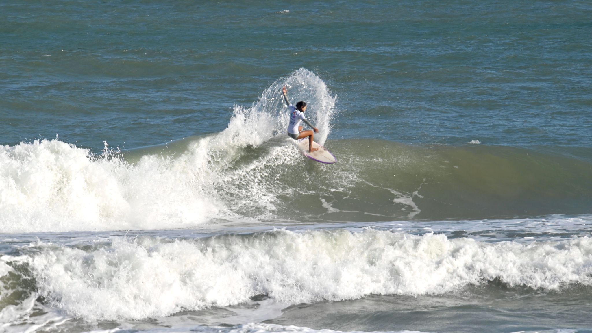 在现场,同学们看到16岁运动健儿杨思琪在浪花中的飒爽英姿,记录下她冲浪精彩瞬间,更为其不断挑战自我,追求更高的体育精神所鼓舞,她在本次全运会中取得了单道浪8.67的高分(10分为满分),这份亮眼成绩让她的信心倍增,最终她获得了本次全运会女子短板冠军。