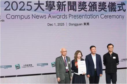 2025年12月1日,由中国日报举办的“2025大学新闻奖”颁奖典礼在香港城市大学(东莞校区)举行。经过专业评审的考核遴选,由凌学敏老师指导,张佳漫、李林凤、叶可欣、郑思彤等4名学生创作的摄影作品《医疗下乡,青春公益共筑健康桥梁》荣获最佳新闻摄影图片季军。
