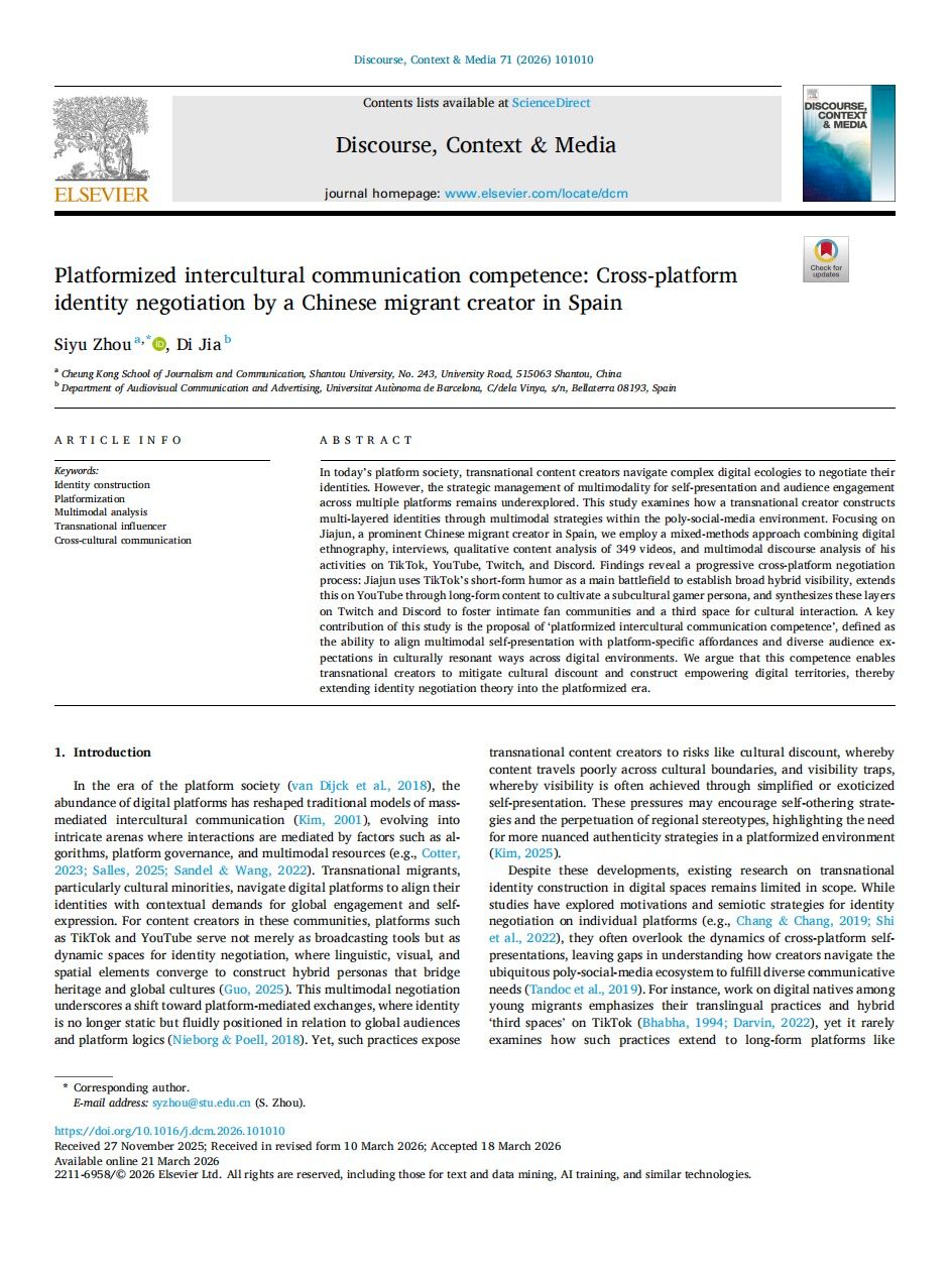 近日,长江新闻与传播学院周斯宇老师在新闻传播学科权威期刊Discourse, Context & Media上发表了题为"Platformized intercultural communication competence: Cross-platform identity negotiation by a Chinese migrant creator in Spain"(P2级)的学术论文。此次成果的发表彰显了汕头大学在跨文化传播研究领域的国际学术影响力与前沿研究实力。