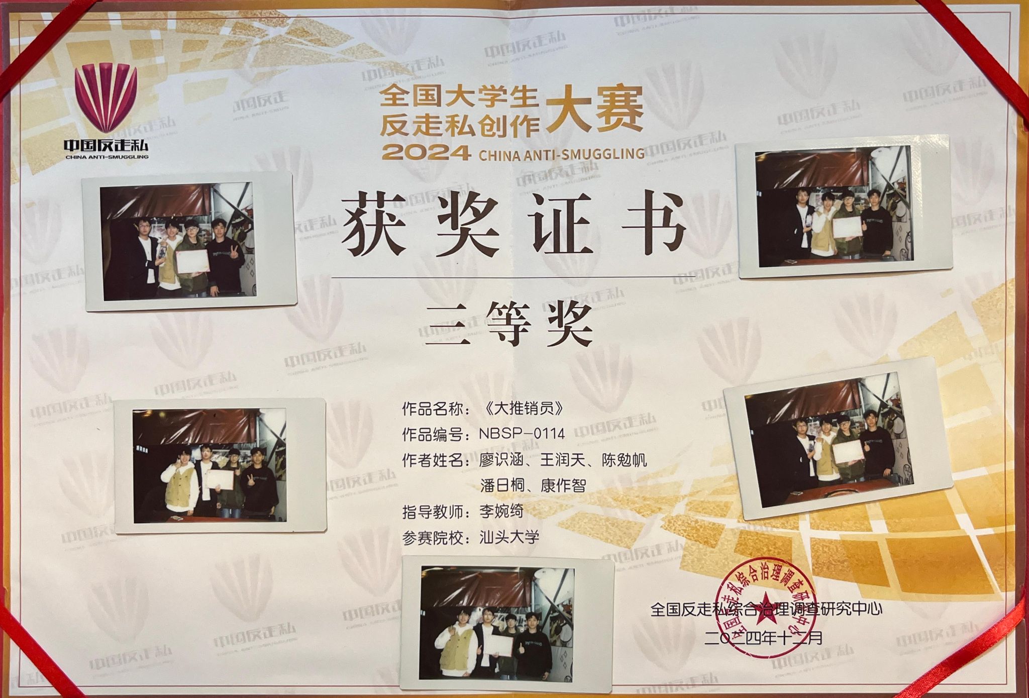 第三届全国大学生反走私创作大赛中斩获全国三等奖