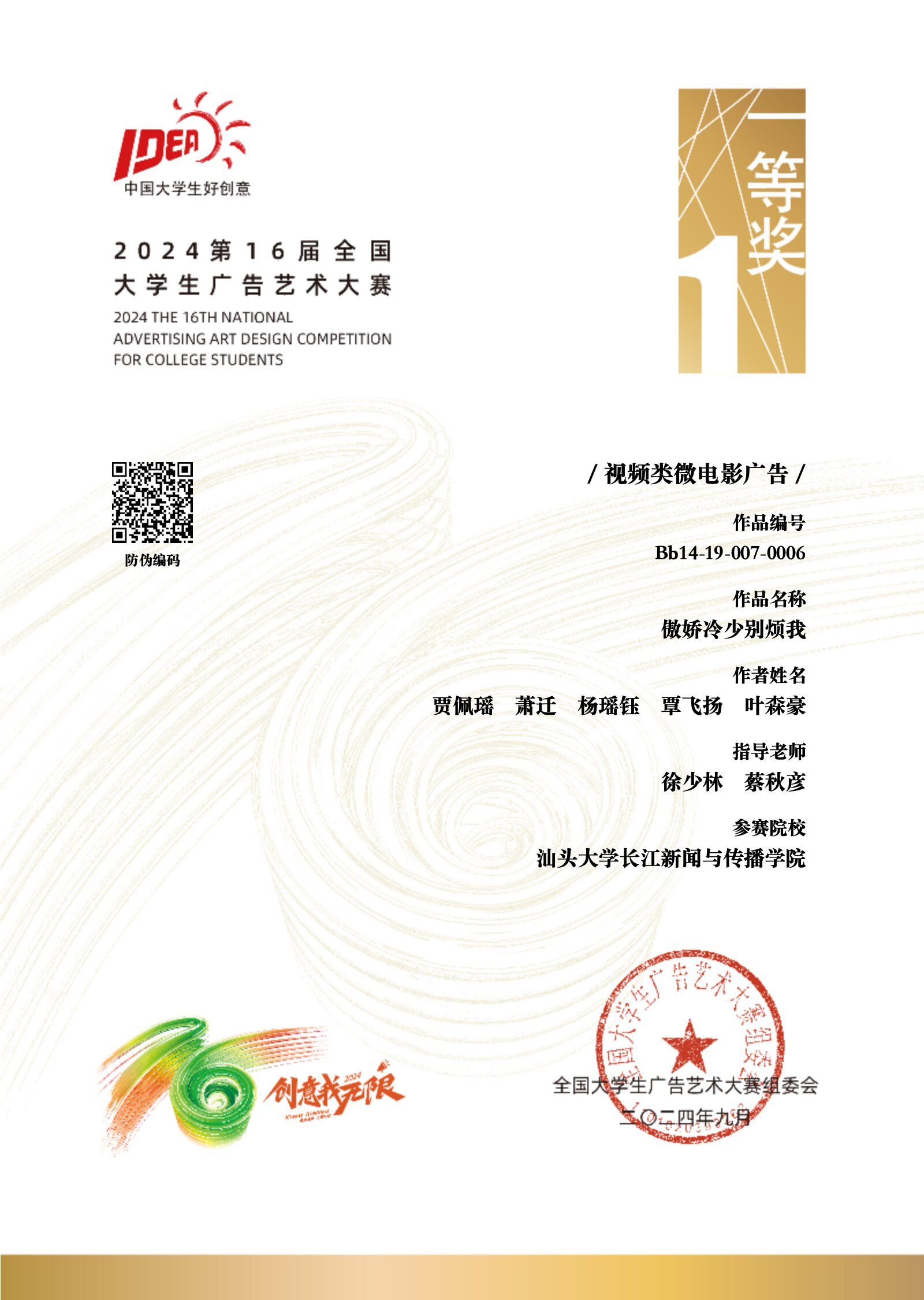 在第16届全国大学生广告艺术大赛全国总评审中,新闻学院还收获了7项国家级优秀奖,分别是凌学敏讲师指导的视频类影视广告作品《讯飞星火,智变由我》,刘钟惠讲师指导的策划案类作品《世界上的另一个我》《999感冒灵?取暖神器》《纯情大男孩三舅》《999感冒灵x续火》《浇点芪斛楂,宝宝不"蔫巴”》《INTO THE Z-POP》。