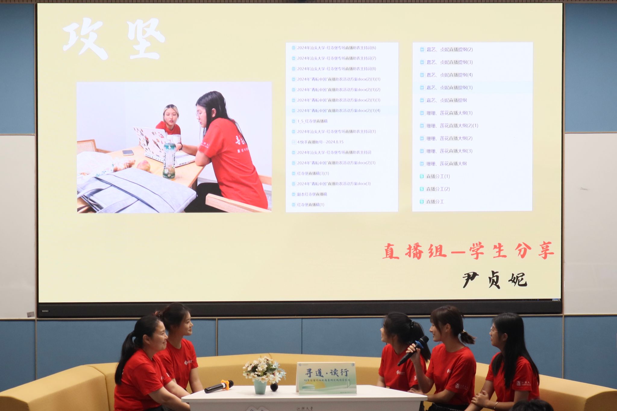 “这个直播稿是谁写的呀,四十多页,那么认真!”这是直播组22级网络与新媒体尹贞妮印象中最深刻的话,是当地对接直播的工作人员对直播人员的夸奖。直播组的成员以攻坚、突围、破局三个关键词,分享了团队如何从零经验的直播小白成长为直播好手的经历。直播组指导老师朱慧斌认为,同学们能团结一致,从幕后走到台前,攻坚克难完成直播很不容易。她还提到,学院正在筹备直播间,给同学提供直播的团队和平台,鼓励同学们参与招募。