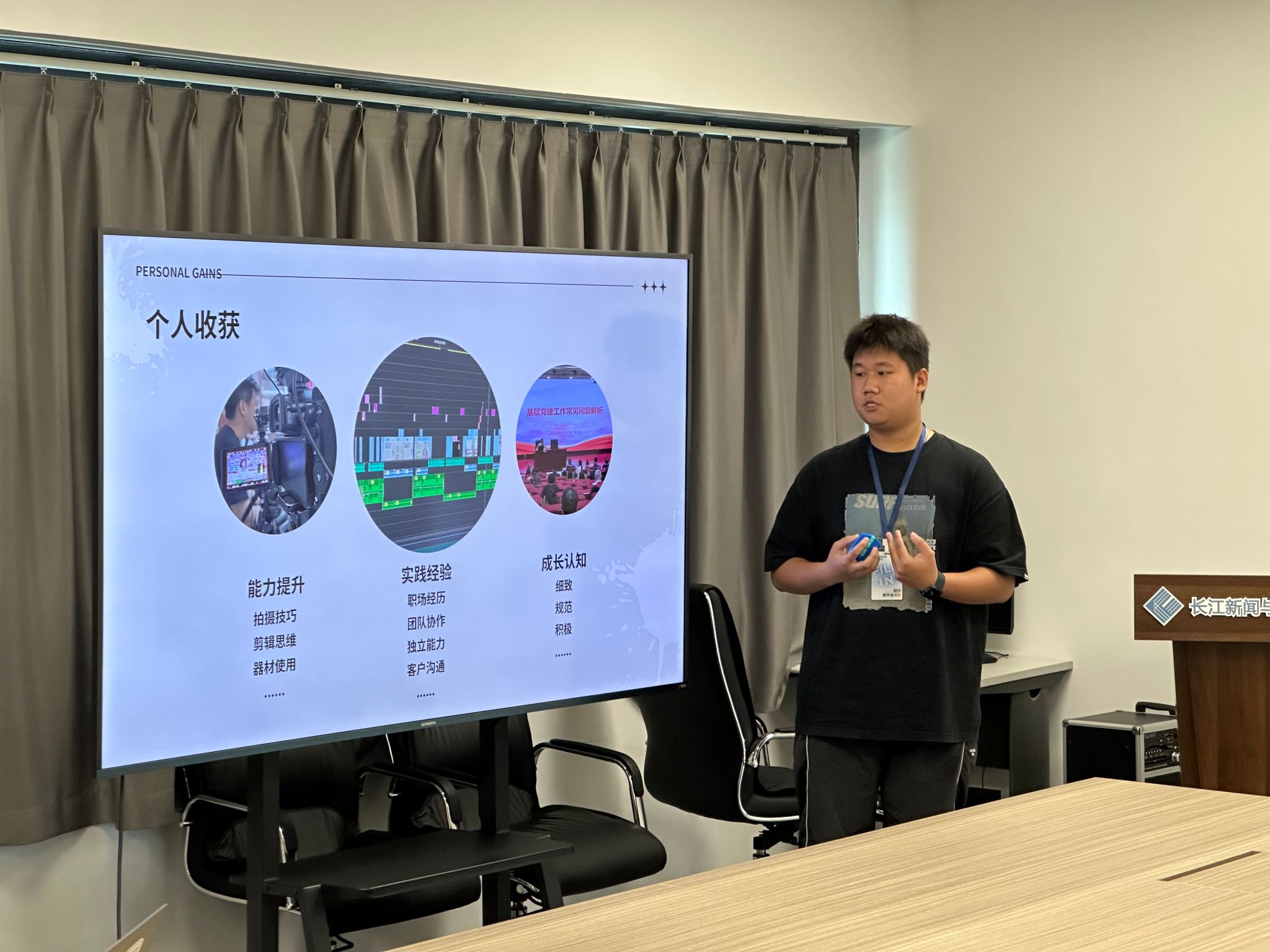 实践中心成员黎宇诚重点分享了在深圳潮创文化科技有限公司的实习经历。他在暑期实习中,参与到了摄像、剪辑、特效制作和制片等工作,“73天累计参与了20多个项目”。回忆起在实习期间遇到的许多有趣的小事,他露出开心的笑容,“为了赶拍摄、找场地,我走遍了深圳的大街小巷和各类机构,甚至驱车去别的城市也是常事”。他认为,加入实践中心并进入行业实习,让他不仅收获了视频制作技术和思维,也培养了细致、规范、积极、乐观的工作态度。