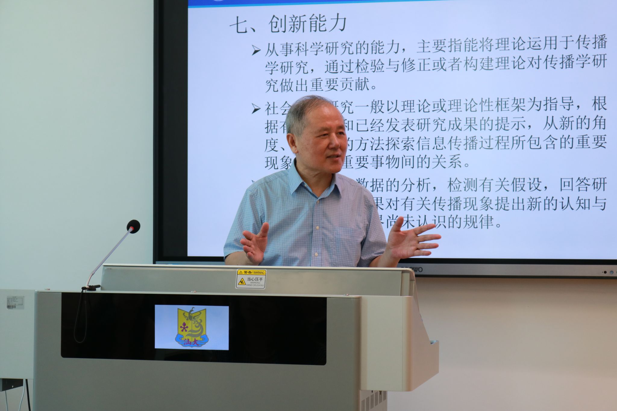 9月26日上午,上海大学新闻传播学院特聘教授李喜根在东海岸校区E教126教室开展学术前沿讲座,面向新闻学院五十余名硕士研究生分享如何开展传播学研究并培养学术能力。本次讲座为汕头大学新闻传播学术前沿系列讲座第11期,由汕头大学数字人文与智能传播研究中心组织承办。学院党委书记余珊燕、负责人毛浩教授,副院长丁智擘、毛良斌等到场聆听讲座,活动由毛良斌主持。